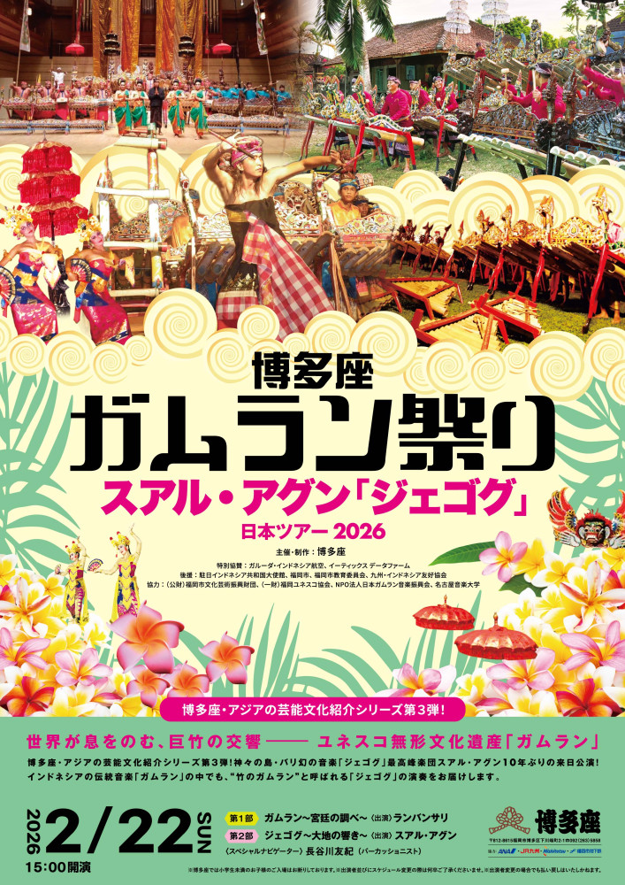主催地である福岡公演は『博多座ガムラン祭り』と題し、日本のガムラングループ「ランバンサリ」も迎えての豪華二部構成。 美しい宮廷舞踊はもちろん、インドネシアと東京を拠点に世界的に活動する舞踊家 リアントが勇壮な男性舞踊も披露します。 さらにミュージカルなどでパーカッショニストとして活躍する長谷川友紀をスペシャルナビゲーターに迎えたスペシャルな公演となります。
