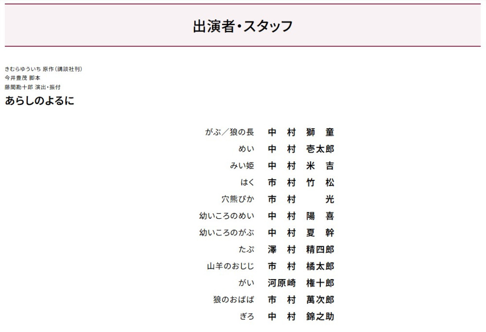 令和8年 二月花形歌舞伎『あらしのよるに』の配役が決定しましたのでお知らせします。