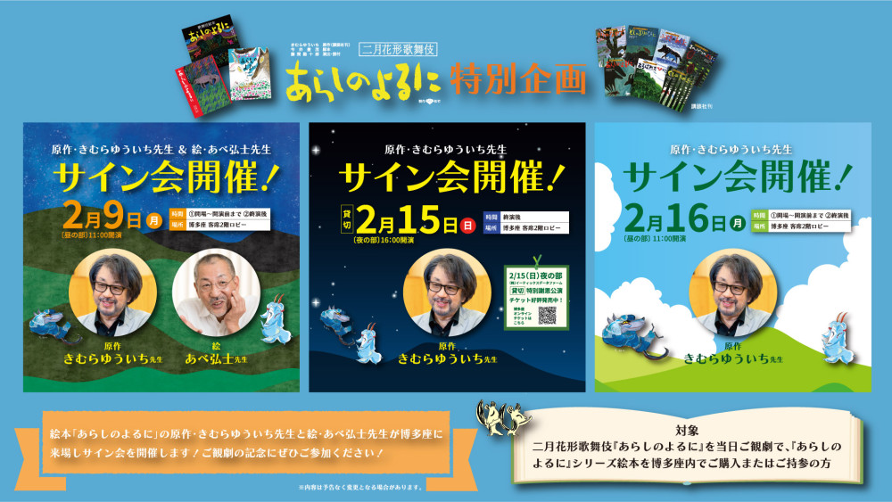 二月花形歌舞伎『あらしのよるに』の特別企画としまして、原作者のきむらゆういち先生とあべ弘士先生のサイン会を開催いたします。当日ご観劇のお客様で「あらしのよるに」シリーズ絵本を博多座内でご購入または、ご持参いただいた方が対象となります。この機会にぜひご参加ください。