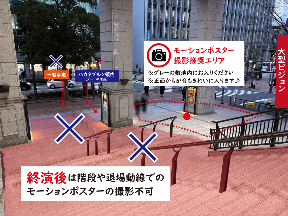 約4分で13名が1巡し、30分間で6回程度流れますのでタイミングを分散して譲り合っての撮影にご協力ください。また撮影は地面がグレーの敷地内にてお願いいたします。終演後はお帰りのお客様の導線確保にもご協力ください。撮影エリアは画像をご参照くださいませ。