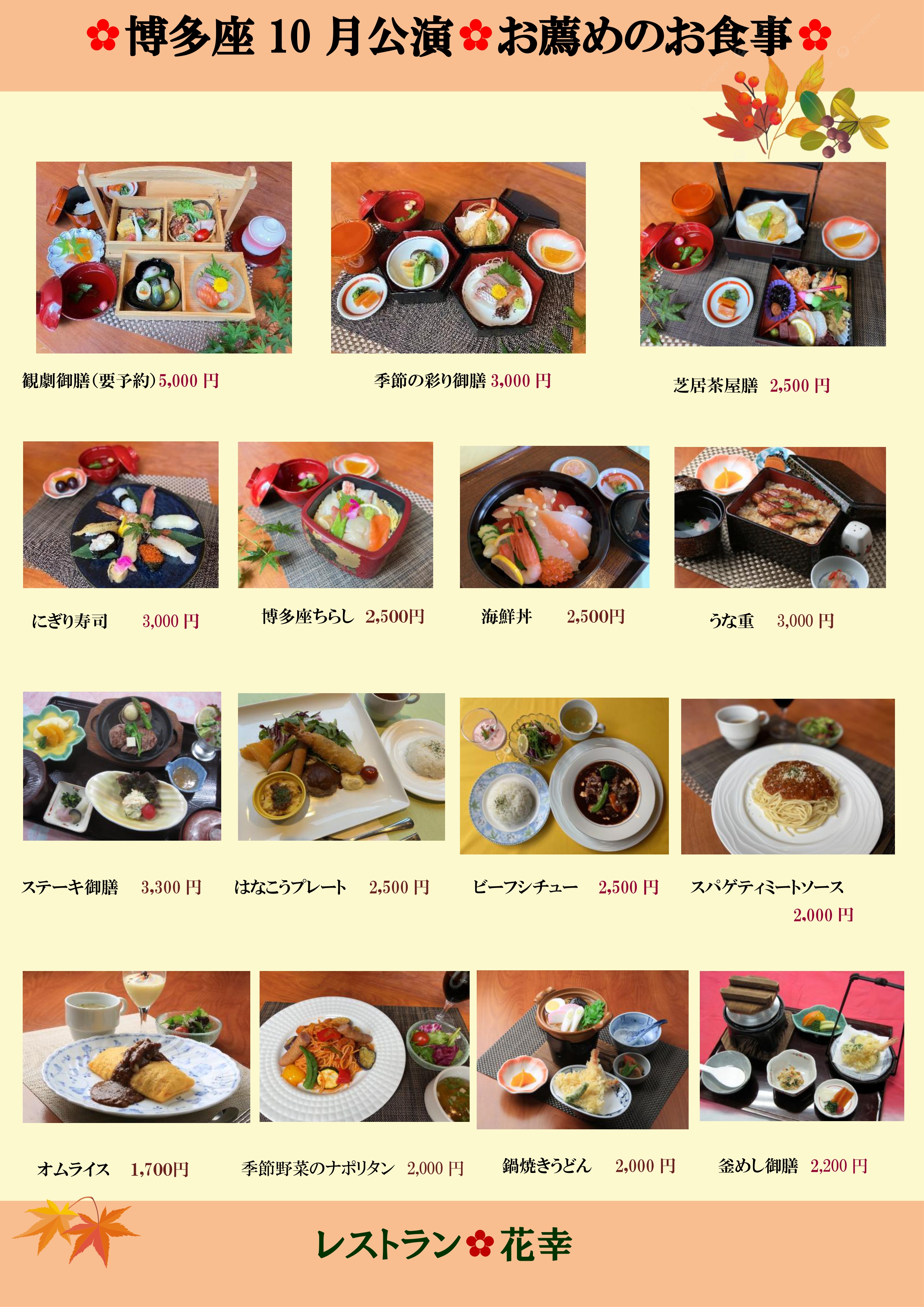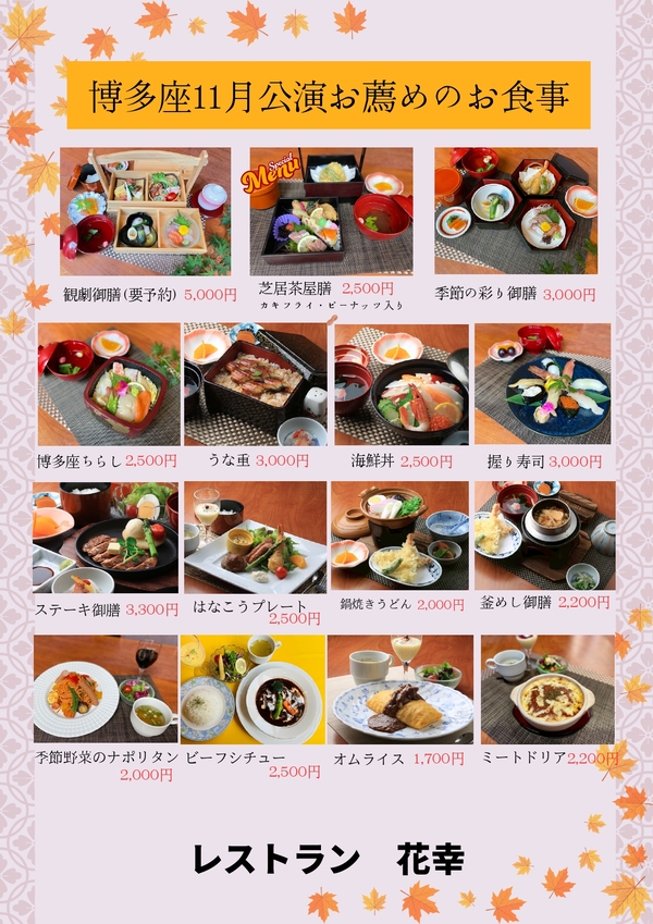 博多座 花幸では、さまざまなお料理をご用意しております。